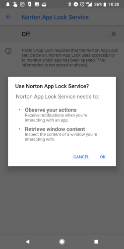 Under “Downloaded services”, a popup will ask you to confirm that Norton will be reading your app content and interacting with your windows. This is necessary, so go ahead and tap “OK” and then switch the locker tick to the “on” position.
