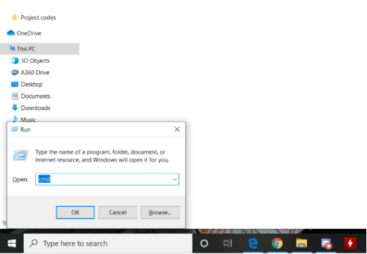 - Press the Windows and R keys simultaneously. A small pop-up window should appear afterward. Type “cmd” in the text field (without quotes) and hit OK.