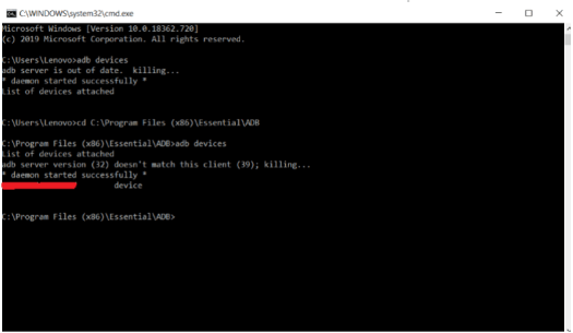 - Your Essential phone should show up as device alongside your serial number. In case your device doesn’t show up, type in the following command “cd C:\Program Files (x86)\Essential\ADB” which essentially navigates to the directory the ADB drivers have been installed. Afterward, type in the previous “adb devices” command. By this stage, your device will be recognized.